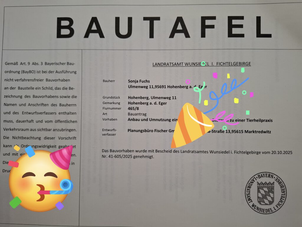 Endlich habe ich die Baugenehmigung für meine neue Praxis erhalten. Ich freue mich so.